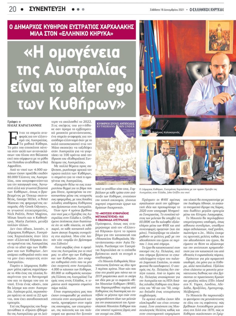 Καταρχήν θέλω θερμά να σας ευχαριστήσω για το βήμα που μου δίνετε, προκειμένου να επικοινωνήσω μέσω της ιστορικής σας εφημερίδας, με τους δεκάδες χιλιάδες αποδήμους Κυθήριους που βρίσκονται στην Αυστραλία. Όταν πριν 4 χρόνια βρέθηκε στο νησί μας ο Πρέσβης της Αυστραλίας στην Ελλάδα κ. Griffin, έμεινε έκπληκτος όταν διαπίστωσε ότι σε κάθε πλατεία, σε κάθε χωριό, σε κάθε κοινωνική εκδήλωση άκουγε διαρκώς συνομιλίες στα αγγλικά. Μου είπε λοιπόν τότε «νομίζω ότι βρίσκομαι στο Σύδνεϋ»! Αυτό ακριβώς είναι η ομογένεια της Αυστραλίας για το νησί μας: το alter ego των Κυθήρων και των Κυθηρίων. Δεν υπάρχει κυθηραϊκό σπίτι που να μην έχει συγγενείς στην Αυστραλία. 4.000 οι κάτοικοι των Κυθήρων, 80.000 οι κυθηραϊκής καταγωγής Έλληνες της Αυστραλίας! Για εμάς τους εντός Ελλάδος, η τεράστια αυτή παροικία σημαίνει πάρα πολλά. Είναι συμπατριώτες μας που έχουν ενσωματωθεί με απόλυτη επιτυχία στην αυστραλιανή κοινωνία, προσφέρουν στον τομέα της οικονομίας, των επιχειρήσεων, της πολιτικής και του πολιτισμού και φυσικά δεν ξεχνούν ποτέ το γενέθλιο τόπο τους. Συμβάλλουν με κάθε τρόπο στην ανάπτυξη των Κυθήρων, ενισχύουν την τοπική οικονομία, γίνονται χορηγοί σημαντικών έργων και δράσεων διαχρονικά.