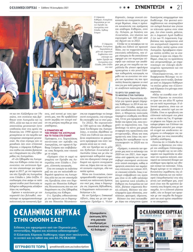 Με τον Πρόεδρο και τα μέλη του Kytherian Association of Australia (όπως και με όλα τα ομογενειακά κυθηραϊκά σωματεία του εξωτερικού) έχουμε μια διαρκή και άριστη συνεργασία τόσο ως Δήμος όσο και ως τοπική κοινωνία ευρύτερα, εδώ και πολλά χρόνια. Μέσω του Association, έχουν χρηματοδοτηθεί σημαντικές κοινωνικές και πολιτιστικές δράσεις στο νησί μας, όπως η δημιουργία της Δημοτικής Βιβλιοθήκης, η διοργάνωση πολιτιστικών εκδηλώσεων κ.λπ. Με τον Πρόεδρο κ. Emmanuel Alfieris, όπως και με τον προηγούμενο Πρόεδρο κ. Victor Kepreotis, έχουμε συνεχή επικοινωνία και συνεργασία για μια σειρά θεμάτων, όπως η πρόταση κατασκευής του αγάλματος του απόδημου Κυθήριου, στην Αγ. Πελαγία, με δαπάνες του Association, στο πλαίσιο των εορτασμών των 100 ετών από την ίδρυσή του το 2022. Ελπίζω να τα καταφέρω και να βρεθώ στο Σύδνευ τον προσεχή Μάιο, για να συμμετάσχω στις επετειακές εκδηλώσεις, που είμαι σίγουρος ότι θα αποτελέσουν αφορμή για την περαιτέρω σύσφιξη των σχέσεων των αποδήμων μας με την πατρίδα και παράλληλα θα γίνουν εφαλτήριο προκειμένου η νέα γενιά Ελλήνων κυθηραϊκής καταγωγής να μάθει και να συνεχίσει την ιστορία των προγόνων της που πριν πολλές δεκαετίες άφησαν το νησί τους για μια πολύ μακρινή χώρα, σε αναζήτηση καλύτερης ζωής.