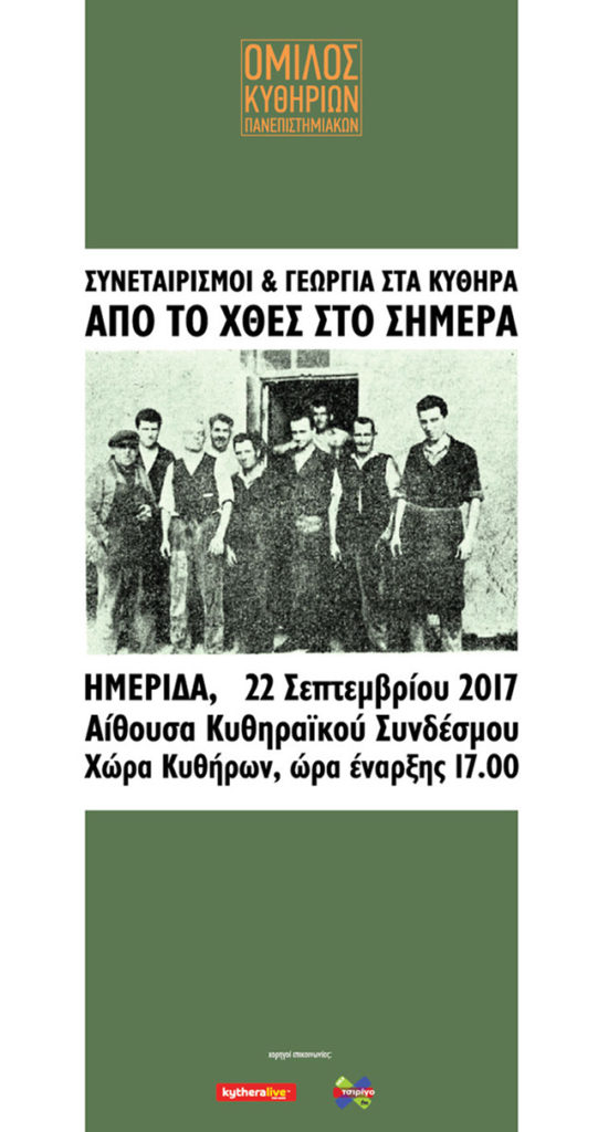 Μια άκρως ενδιαφέρουσα και χρήσιμη ημερίδα διοργανώθηκε από τον Όμιλο Κυθηρίων Πανεπιστημιακών, την Παρασκευή 22/9 στην αίθουσα του Κυθηραϊκού Συνδέσμου Κυθήρων, με θέμα ”Συνεταιρισμοί & Γεωργία στα Κύθηρα από το Χθες στο Σήμερα”.