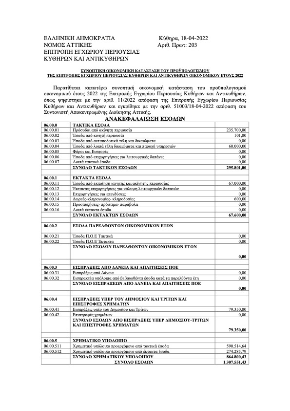 ΣΥΝΟΠΤΙΚΗ ΟΙΚΟΝΟΜΙΚΗ ΚΑΤΑΣΤΑΣΗ ΤΟΥ ΠΡΟΫΠΟΛΟΓΙΣΜΟΥ ΤΗΣ ΕΕΠΚΑ ΤΟΥ ΟΙΚΟΝΟΜΙΚΟΥ ΕΤΟΥΣ 2022