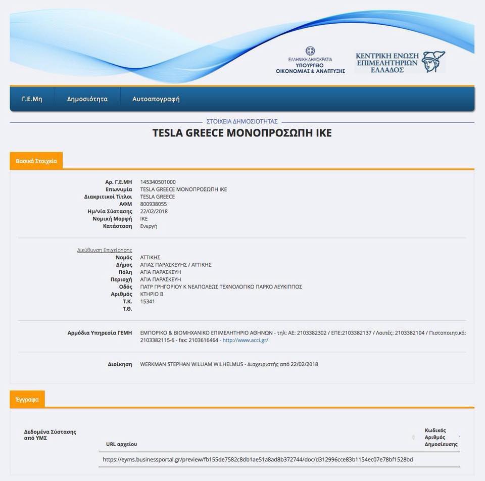 «Ο Δημόκριτος καλωσορίζει την Tesla Greece στο Τεχνολογικό του Πάρκο» έγραφε το δελτίο Τύπου του Εθνικού Κέντρου Ερευνας Φυσικών Επιστημών «Δημόκριτος». Για τους μη γνωρίζοντες η ανακοίνωση έμοιαζε με κάποια από τις γνωστές «επεμβάσεις» των τρολ του Διαδικτύου. Για τους πιο δύσπιστους όμως, ήρθε και η σχετική καταχώριση της νέας εταιρείας στο ΓΕΜη, με έδρα το Τεχνολογικό Πάρκο Λεύκιππος στην Αγία Παρασκευή Αττικής και διαχειριστή τον Στέφαν Βέρκμαν.