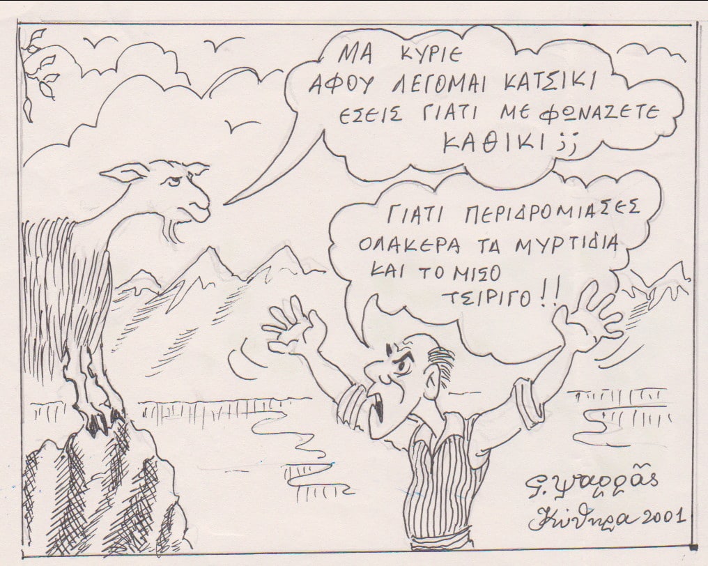Εκεί, όσο μειωνόταν ο ανθρώπινος πληθυσμός, τόσο αυξανόταν αυτός των κατσικιών. Όχι μόνο, επειδή είναι εξαίρετο έδεσμα, αλλά και για οικονομικούς λόγους, καθώς ήταν ένα μικρό, αλλά αναγκαίο συμπλήρωμα του εισοδήματος μερικών κατοίκων, που φύλαγαν τους άγονους βράχους του νησιού. Ως εδώ, θα μπορούσαμε να πούμε. Καλά. Όμως, είναι γνωστό ότι σε αυτό το κράτος κάνει ο καθένας ό,τι θέλει και ουδείς νόμος ισχύει. Τώρα, π.χ. περιμένουμε την απόφαση των υπουργών. Τόσα χρόνια, που στο γειτονικό μας νησάκι θανατώνονται εκατοντάδες κατσίκια το χρόνο και καταλήγουν στα στομάχια μας, γιατί δεν εφαρμόστηκε ποτέ κάποιος από τους νόμους που ήδη ισχύουν; Θα πείτε. Καλώς γίνεται. Μάλιστα. Τότε γιατί δεν γίνεται και στα Κύθηρα παρά «ενοικιάζονται» ή «προσλαμβάνονται» ειδικοί για να τηρούνται τα προσχήματα; Η πραγματικότητα κι εδώ ξεπερνά τους νόμους και τις προθέσεις ακόμη και της καλλίτερης και αποτελεσματικότερης τοπικής ηγεσίας. Γιατί και στα Κύθηρα πέφτει –και χωρίς την ….υπουργική απόφαση που περιμένουμε- ανηλεές κυνήγι. Όμως αυτά πολλαπλασιάζονται με πλέον έντονους ρυθμούς. Θέλετε που οι άνθρωποι που ασχολούνται με την οργανωμένη κτηνοτροφία λιγοστεύουν, θέλετε η εγκατάλειψη των παλιών χωραφιών, θέλετε η πρόνοια της φύσης για τη …διατήρηση των κατσικιών, αυτά, παρά το κυνήγι, αυξάνονται.