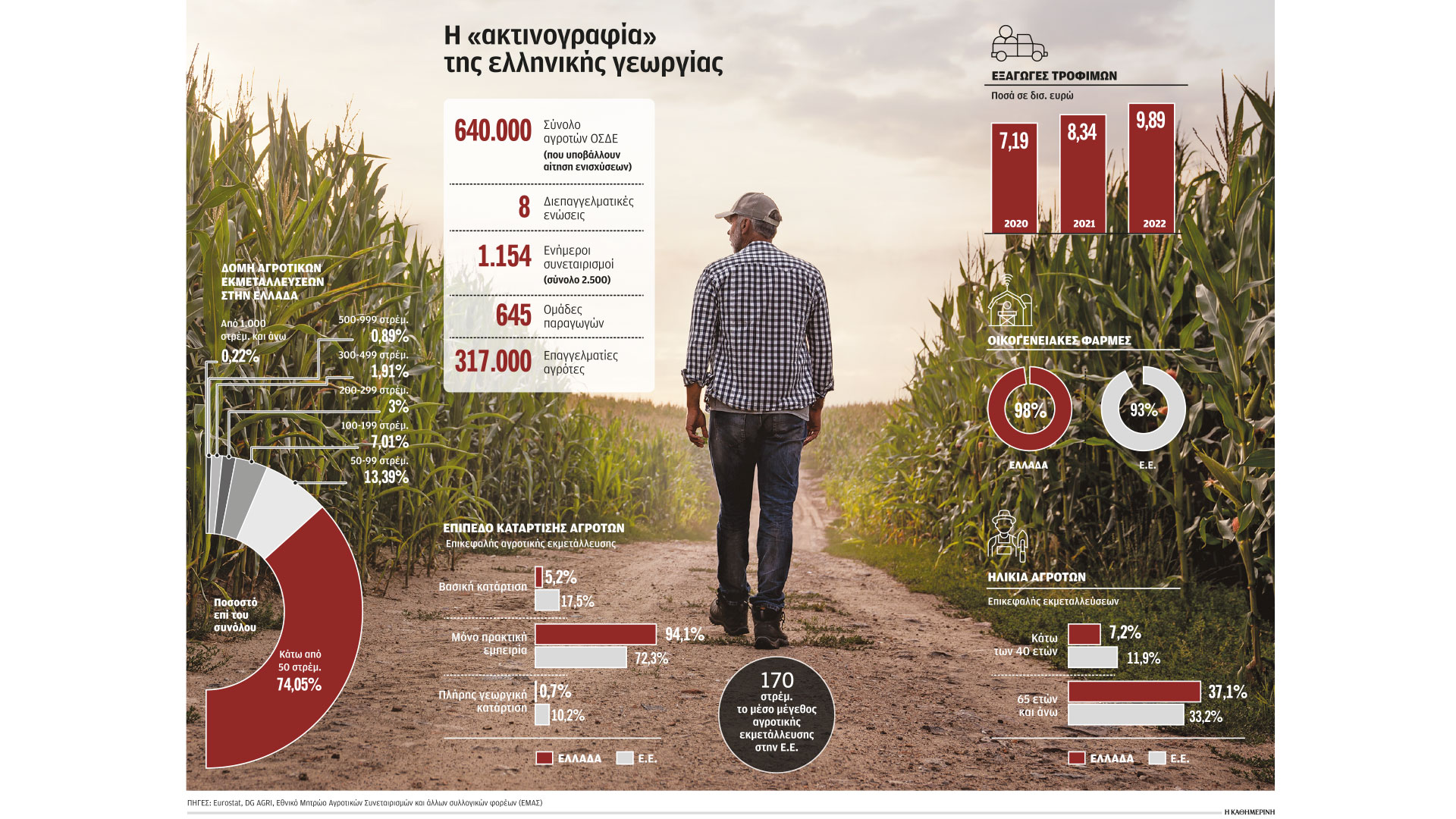 Τα τελευταία διαθέσιμα στοιχεία της Eurostat (2020) είναι αποκαλυπτικά. Σχεδόν 4 στους 10 επικεφαλής αγροτικών εκμεταλλεύσεων είναι ηλικίας από 65 ετών και άνω, ενώ οι λεγόμενοι νέοι αγρότες (ηλικίας κάτω των 40 ετών) είναι μόλις το 7,2% των επικεφαλής των αγροτικών εκμεταλλεύσεων. Συνολικά στην Ευρωπαϊκή Ενωση το ποσοστό των επικεφαλής αγροτικών εκμεταλλεύσεων ηλικίας άνω των 65 ετών είναι 33,2%, ενώ οι νέοι αγρότες αποτελούν το 11,9%.