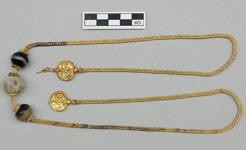 Ο σκελετός του άντρα βρέθηκε στο δάπεδο του μνημείου μέσα σε ξύλινο φέρετρο, με όπλα και ημιπολύτιμους λίθους (αμέθυστος, αχάτης, χρυσός κ.ά.), σφραγιδόλιθους και προσωπικά αντικείμενα. Κοντά στον λαιμό του είχε τοποθετηθεί μια σπάνια και εξαιρετικά διατηρημένη χρυσή αλυσίδα, αλλά και πλήθος κοσμημάτων. Πρώτη θεωρία που ανατράπηκε ήδη από την ανασκαφή: τα κοσμήματα δεν συνόδευαν μόνο τις γυναικείες ταφές.