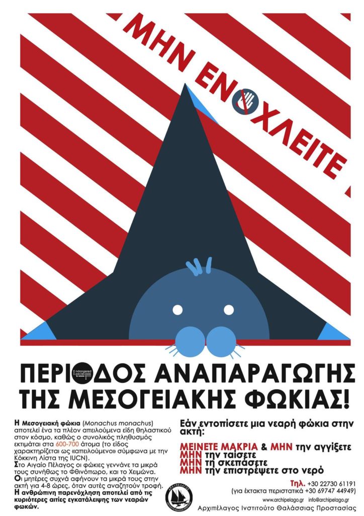 Οι απειλούμενες Μεσογειακές φώκιες (Monachus monachus) γεννάνε τα μικρά τους στο Αιγαίο το φθινόπωρο και τον χειμώνα. Οι μητέρες συνήθως αφήνουν τα μικρά τους στην ακτή για 4-8 ώρες, όταν αυτές αναζητούν τροφή. Η ανθρώπινη παρενόχληση αποτελεί από τις κυριότερες αιτίες εγκατάλειψης των νεαρών φωκών.