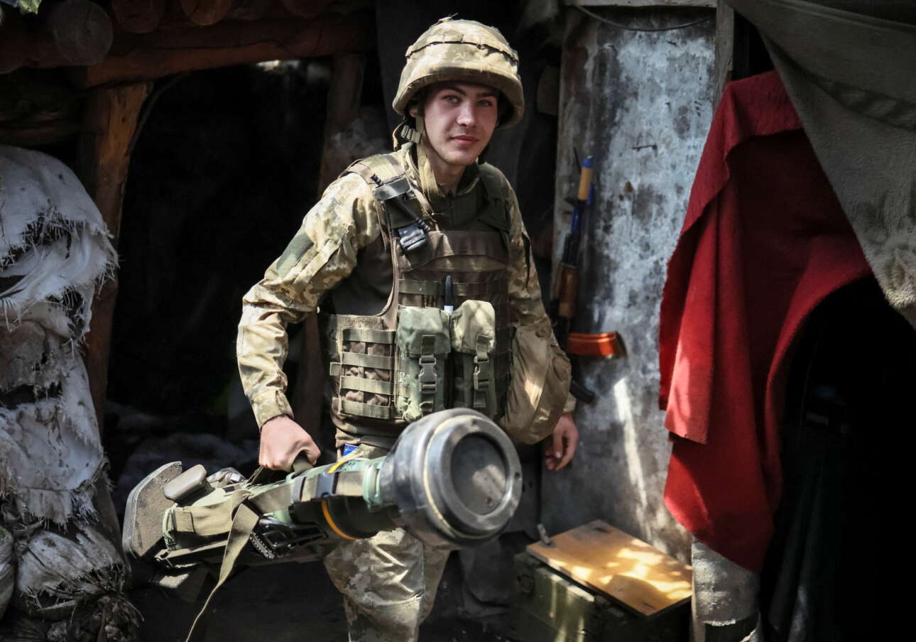 Ενας ουκρανός στρατιώτης κρατά ένα αντιαρματικό όπλο NLAW στο μέτωπο του Ντονμπάς – REUTERS/Gleb Garanich