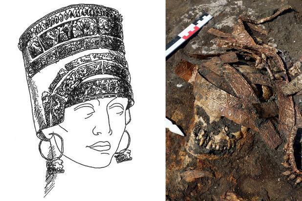 Δεξιά, το χρυσό διάδημα, όπως βρέθηκε στο κρανίο του γυναικείου σκελετού και αριστερά η αναπαράστασή του στο κεφάλι της γυναίκας