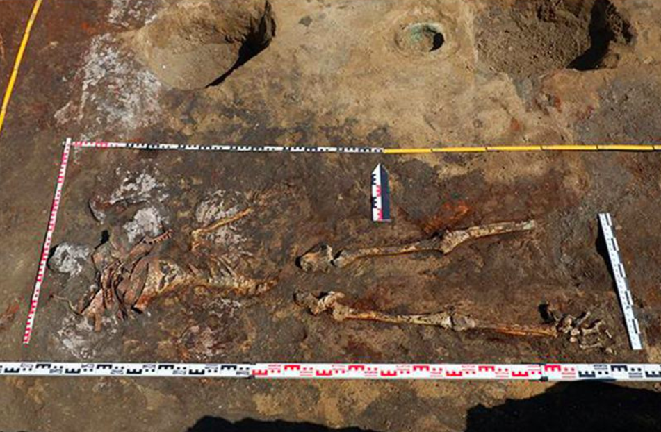 Ο ένας σκελετός ανήκει σε μία 20χρονη γυναίκα, που είχε ταφεί με τα πόδια της στη στάση που έχουν οι ιππείς. Πλάι της βρέθηκαν δύο ακόντια, ένας καθρέπτης από χαλκό, ένα βραχιόλι με χρυσές χάντρες και δύο αρχαιοελληνικά δοχεία, το ένα από τα οποία είναι κάνθαρος, που χρονολογείται από το δεύτερο τέταρτο του τέταρτου αιώνα π.Χ.