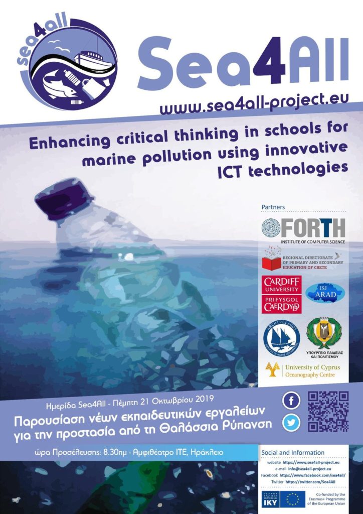 Ημερίδα με τη συμμετοχή του Ινστιτούτου Θαλάσσιας Προστασίας «Αρχιπέλαγος» πραγματοποιήθηκε την Πέμπτη 21/10 στο Ινστιτούτο Τεχνολογικής Έρευνας Κρήτης, στα πλαίσια του έργου Sea4all που εδώ και δύο χρόνια εργάζεται στην ανάπτυξη καινοτόμων παιδαγωγικών εργαλείων με θέμα τη θαλάσσια ρύπανση. Το έργο Sea4all στοχεύει στην ενίσχυση της οικολογικής συνείδησης μαθητών και εκπαιδευτικών μέσω της χρήσης καινοτόμων διδακτικών πρακτικών σε θέματα θαλάσσιας ρύπανσης με έμφαση στις πετρελαιοκηλίδες και τα επιπλέοντα πλαστικά απορρίμματα. Τα τελευταία δύο χρόνια σχεδιάστηκαν καινοτόμα εκπαιδευτικά εργαλεία και υλικό για τη μεταφορά των επιστημονικών γνώσεων σε όλη την εκπαιδευτική κοινότητα, χρησιμοποιώντας κυρίως νέες εκπαιδευτικές προσεγγίσεις και ψηφιακά εκπαιδευτικά περιβάλλοντα.