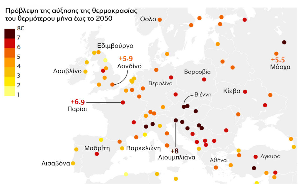 Η θερμοκρασία των πόλεων της Ευρώπης θα αυξηθεί κατά μέσον όρο κατά 2,5 βαθμούς Κελσίου στη διάρκεια του έτους. Σε παγκόσμιο επίπεδο, οι θερμοκρασίες είναι πιθανόν να αυξηθούν κατά 2,4 βαθμούς Κελσίου κατά μέσον όρο, που αρκούν για να σκοτώσουν κάθε κοραλλιογενή βράχο και να τινάξουν στον αέρα τους στόχους της Συμφωνίας του Παρισιού.