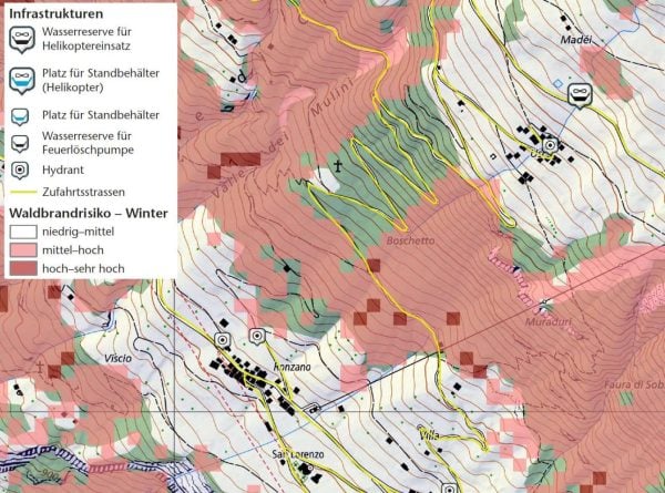 Απόσπασμα από τον χάρτη κινδύνου δασικής πυρκαγιάς δασικής περιοχής του Τιτσίνο. Διακρίνονται στο χάρτη δεξαμενές υδροληψίας για ελικόπτερο και για πυροσβεστικές αντλίες, θέσεις πυροσβεστικών κρουνών καθώς και οι δρόμοι πρόσβασης.