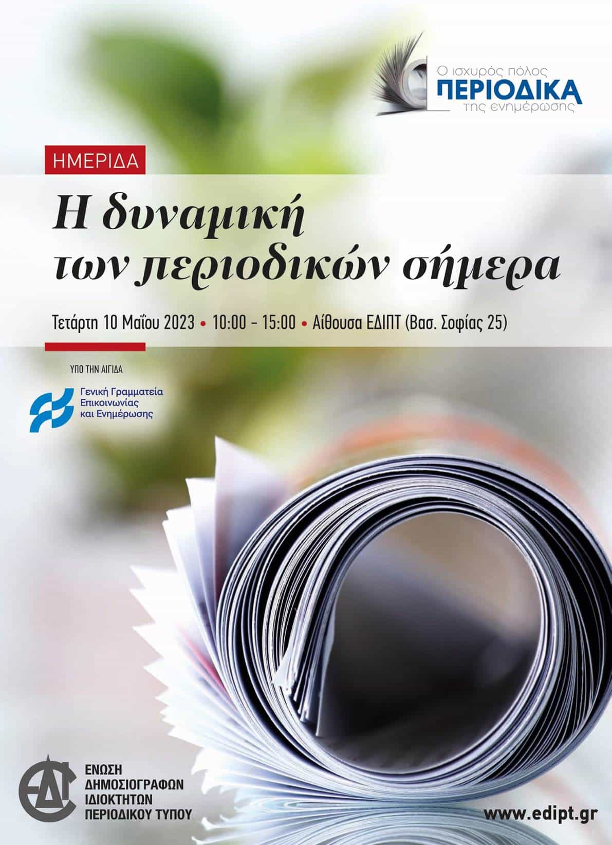 Η ημερίδα με τίτλο “Η δυναμική των περιοδικών σήμερα” θα πραγματοποιηθεί την Τετάρτη 10 Μαΐου 2023 στην αίθουσα εκδηλώσεων της ΕΔΙΠΤ επί της οδού Βασιλίσσης Σοφίας 25 και ώρες 10:00 έως 15:00..