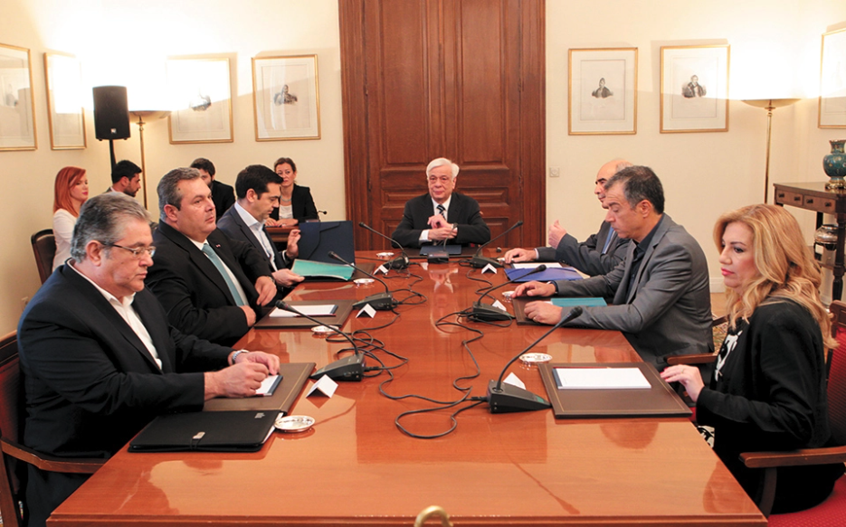 Ο τέως πρωθυπουργός έφτασε στο Προεδρικό Μέγαρο συνοδευόμενος από τον Νίκο Παππά και τον Παναγιώτη Λαφαζάνη. Ο τελευταίος διέκοψε τη σύσκεψη λίγη ώρα αργότερα και ενημέρωσε τον κ. Τσίπρα ότι το αίτημα του Μεγάρου Μαξίμου προς το Κρεμλίνο για μια τηλεφωνική επικοινωνία μεταξύ των δύο ηγετών είχε γίνει δεκτό και ο Ρώσος πρόεδρος ήταν έτοιμος να συνομιλήσει με τον Ελληνα ηγέτη. «Είδα τη χαρά του Λαφαζάνη όταν μας διέκοψε για να πει στον Τσίπρα για τον Πούτιν», λέει στην «Κ» πολιτικός αρχηγός αναφερόμενος στην εμφανή βεβαιότητα του βετεράνου αριστερού πολιτικού ότι, έστω και με καθυστέρηση 70 ετών, είχε έρθει επιτέλους η στιγμή για να περάσει η Ελλάδα στη ρωσική σφαίρα επιρροής.
