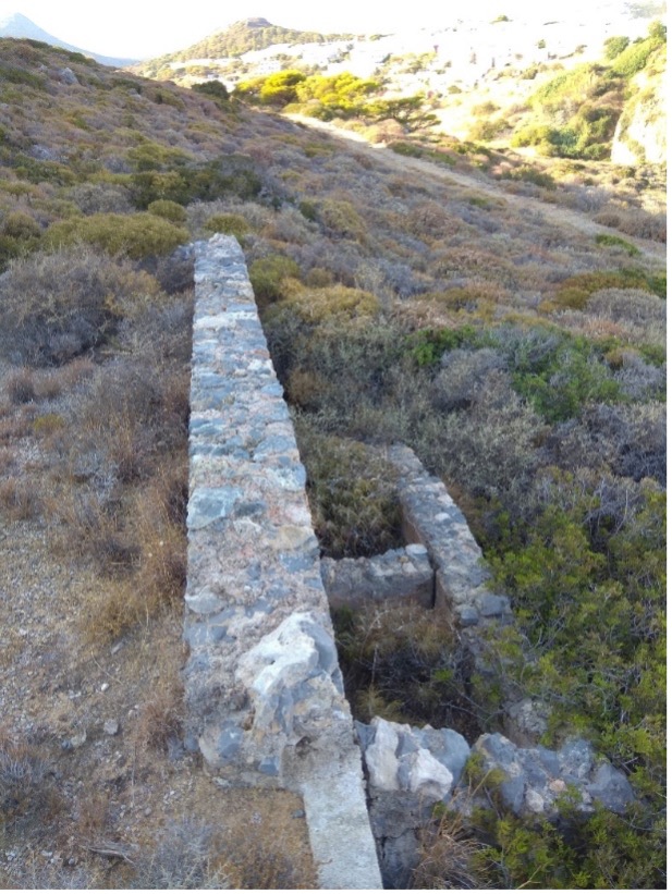 Δεν γνωρίζουμε κάτι σχετικά με την κατασκευή αυτή. Η ύπαρξη όμως ερειπίων δίχωρου οικίσκου, με στέρνα, που έχει πελεκημένα από πωρόλιθο ρείθρα, αλλά και η ύπαρξη διπλής ποτίστρας μας κινεί το ενδιαφέρον. Οι τεχνικές είναι παραδοσιακές αλλά το μέγεθος είναι ιδιαίτερα μεγάλο για χωραφόσπιτο ή απλό σημείο εξυπηρέτησης κοπαδιών αιγοπροβάτων. Το νερό και η αποθήκευση και χρήση του είναι ένα στοιχείο που οι Άγγλοι επιμένουν, μέσω έργων τους, στο νησί. Δεν μπορούμε να είμαστε σίγουροι αλλά ενδεχόμενα οι ποτίστρες εξυπηρετούσαν ζώα μεταφοράς. Ποιας μεταφοράς όμως; Η τελευταία φορά που χρησιμοποιήθηκαν ζώα μεταφοράς στην ευρύτερη ήταν κατά την διάρκεια της Κατοχής (1941-44), με την κατασκευή του αμαξιτού δρόμου προς εξυπηρέτηση των Γερμανών και του φυλακίου του Τράχηλα και την συντήρησή του. Μήπως εδώ υπήρχε σημείο εξυπηρέτησης του σηματωρείου; Κι αν ναι γιατί εδώ και όχι πιο κοντά προς το σηματωρείο; Όπως και να έχει το πράγμα η κατασκευή είναι αρκετά προσεγμένη και δεν είναι απίθανο να πρόκειται για ιδιωτική κατασκευή. Άλλωστε οι πρόγονοί μας μας έχουν αποδώσει καταπληκτικές κατασκευές.