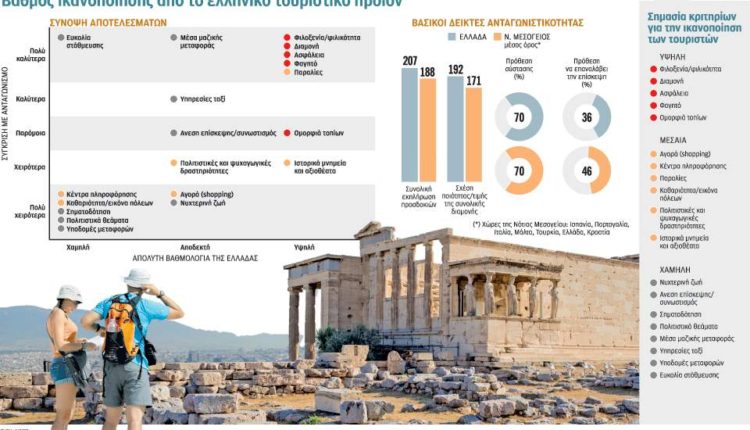 Το ελληνικό τουριστικό προϊόν «πονάει» όπου εξαρτάται από το Δημόσιο και χάνει έτσι πόντους στις διεθνείς αγορές, παρά το γεγονός πως συγκεντρώνει πολύ υψηλά ποσοστά ικανοποίησης στις περισσότερες από τις υπόλοιπες κατηγορίες κριτηρίων έναντι των ανταγωνιστικών του προορισμών. Ετσι οι ταξιδιώτες που έχουν ήδη επισκεφθεί την Ελλάδα μία φορά δηλώνουν πως θα ξαναέρθουν σε μικρότερο ποσοστό έναντι αυτών που δηλώνουν πως θα ξαναεπισκέπτονταν μια άλλη ανταγωνιστική χώρα. Το ποσοστό πρόθεσης επανάληψης της επίσκεψης για την Ελλάδα ανέρχεται στο 36% του συνόλου έναντι 46% για τους ευθέως ανταγωνιστικούς προορισμούς και συγκεκριμένα τις χώρες της Νότιας Μεσογείου όπως η Ισπανία, η Πορτογαλία, η Ιταλία, η Μάλτα, η Τουρκία και η Κροατία, παρά το γεγονός πως έχουν χαμηλότερη βαθμολογία στα κύρια κριτήρια ικανοποίησης των τουριστών.