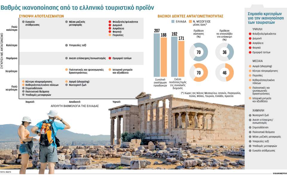 Επίσης, παρά την υψηλή βαθμολογία της χώρας ως προς την ικανοποίηση των επισκεπτών και τη σχέση ποιότητας-τιμής, η Ελλάδα μειονεκτεί έναντι των ανταγωνιστριών χωρών ως προς τη διάθεση των επισκεπτών να επαναλάβουν το ταξίδι τους. Η πρόθεση των τουριστών να επανέλθουν στη χώρα μας, μπορεί να ενισχυθεί με την παροχή περισσότερων συνδυαστικών και καινοτόμων εμπειριών, ισχυροποιώντας τα υπάρχοντα ανταγωνιστικά πλεονεκτήματα που προαναφέρθηκαν, σημειώνει το ΙΝΣΕΤΕ.