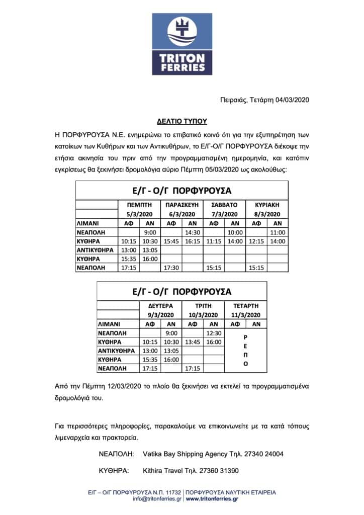 Ανακοινώσεις _ Δελτία Τύπου Tο Ε/Γ-Ο/Γ ΠΟΡΦΥΡΟΥΣΑ διέκοψε την ετήσια ακινησία του – τα δρομολόγια ξεκινούν Πέμπτη 05/03/2020 την Μαρ 4, 2020 530