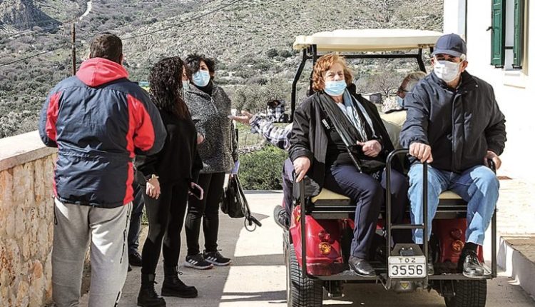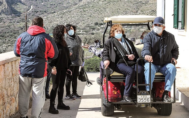 Κάθε τόσο το αυτοκινητάκι του γκολφ φέρνει και άλλους πολίτες. Οι δύο νεαροί που το οδηγούν είναι τρυφεροί και υποστηρικτικοί προς όλους τους ηλικιωμένους και πολύ συχνά σταματούν στη μέση της διαδρομής για να πάρουν κάποιον που έχει αρχίσει να ανεβαίνει ποδαράτο αλλά ζορίζεται. «Τι να πονέσω; Τρεις γέννες έχω κάνει, τα παλιά χρόνια εδώ πέρα δεν είχαμε ούτε γιατρούς ούτε τίποτα», έλεγε μια γερόντισσα στην εγγονή της που τη συνόδευε και τη ρωτούσε συνεχώς αν φοβάται. Δίπλα της καθόταν η Ρηγοπούλα Σφυρίου, που συμπλήρωνε: «Δεν θα μείνει κανείς μας που να μην έρθει. Ζούμε σε έναν τόπο απομονωμένο, ο καιρός είναι συχνά κακός, αν αρρωστήσεις εδώ από τον ιό ή κάτι άλλο, δεν είναι εύκολα τα πράγματα».