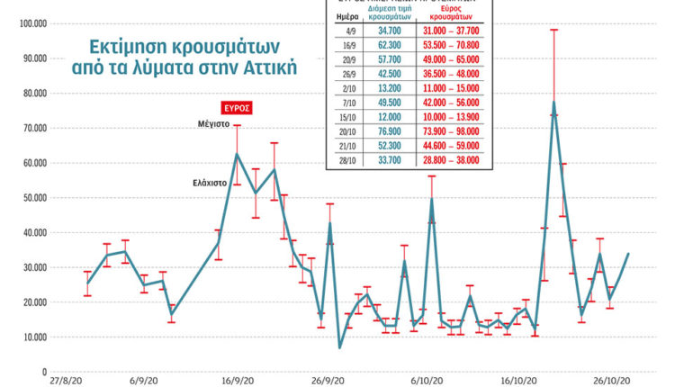 «Η πρώτη εκτίναξη του αριθμού των κρουσμάτων σημειώθηκε μεταξύ 16 και 20 Σεπτεμβρίου, όταν καταγράφηκαν 62.300 και 57.700 κρούσματα αντιστοίχως. Στην πρώτη περίπτωση το εύρος της εκτίμησης ήταν από 53.000 έως 71.000 κρούσματα και στη δεύτερη από 49.000 έως 65.000. Στη συνέχεια ελήφθησαν μέτρα και οι τιμές υποχώρησαν για να σταθεροποιηθούν λίγο πάνω από τις 10.000 στο δεύτερο δεκαήμερο του Οκτωβρίου και να ξαναπάρουν απότομα την ανηφόρα στις 20 του μηνός, ξεπερνώντας τις 70.000, τιμή που μεταφράζεται σε επιπολασμό της νόσου περίπου 2%. Τις τελευταίες μέρες τα ενεργά κρούσματα υπολογίζονται στις 33.000 με 40.000, με επιπολασμό 0,8% έως 1%. Διαπιστώνεται μια σταθεροποίηση, ίσως λόγω της εντατικοποίησης των μέτρων». Εκείνο που παρατηρεί κανείς είναι ότι ο επιπολασμός, δηλαδή η συχνότητα εμφάνισης της νόσου στον πληθυσμό, όπως αυτός προκύπτει από τα τεστ του ΕΟΔΥ, εμφανίζει ελαφρώς υψηλότερες τιμές από εκείνες που δίνουν οι αναλύσεις στα λύματα. Η διαφορά αυτή οφείλεται κατά τον πανεπιστημιακό καθηγητή, στο γεγονός ότι «τα δειγματοληπτικά τεστ του ΕΟΔΥ πραγματοποιούνται στοχευμένα, μεταξύ ύποπτων κρουσμάτων. Αντίθετα οι αναλύσεις στα λύματα γίνονται “χωρίς προκατάληψη” σε δείγματα από το σύνολο του πληθυσμού του λεκανοπεδίου. Η αλήθεια ίσως βρίσκεται κάπου στη μέση. Πάντως, εκείνο που ενδιαφέρει την επιτροπή δεν είναι οι απόλυτες τιμές, αλλά η αποτύπωση της τάσης. Αξιολογεί μια πληθώρα δεδομένων, εξετάζει τα αποτελέσματα των τεστ του ΕΟΔΥ και των αναλύσεων στα λύματα, προσμετρά την πίεση στο σύστημα υγείας, τις εισαγωγές στα νοσοκομεία και στις ΜΕΘ, τους θανάτους και προτείνει μέτρα συνυπολογίζοντας το σύνολο των δεικτών».