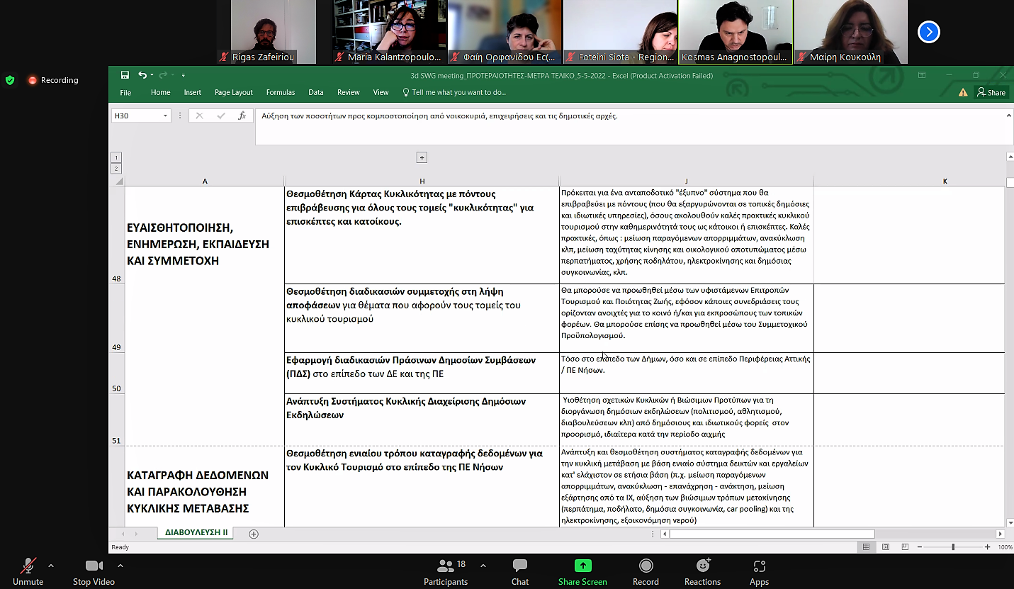 Κατά τη διαβούλευση αυτή, εξειδικεύθηκαν σε συγκεκριμένα μέτρα οι στρατηγικές προτεραιότητες που αναδείχθηκαν στο προηγούμενο εργαστήρι και αφορούν τους 4 τομείς, οι οποίοι είναι κρίσιμοι για την αειφόρο τουριστική ανάπτυξη (Ενέργεια, Κινητικότητα, Απορρίμματα, Νερό).