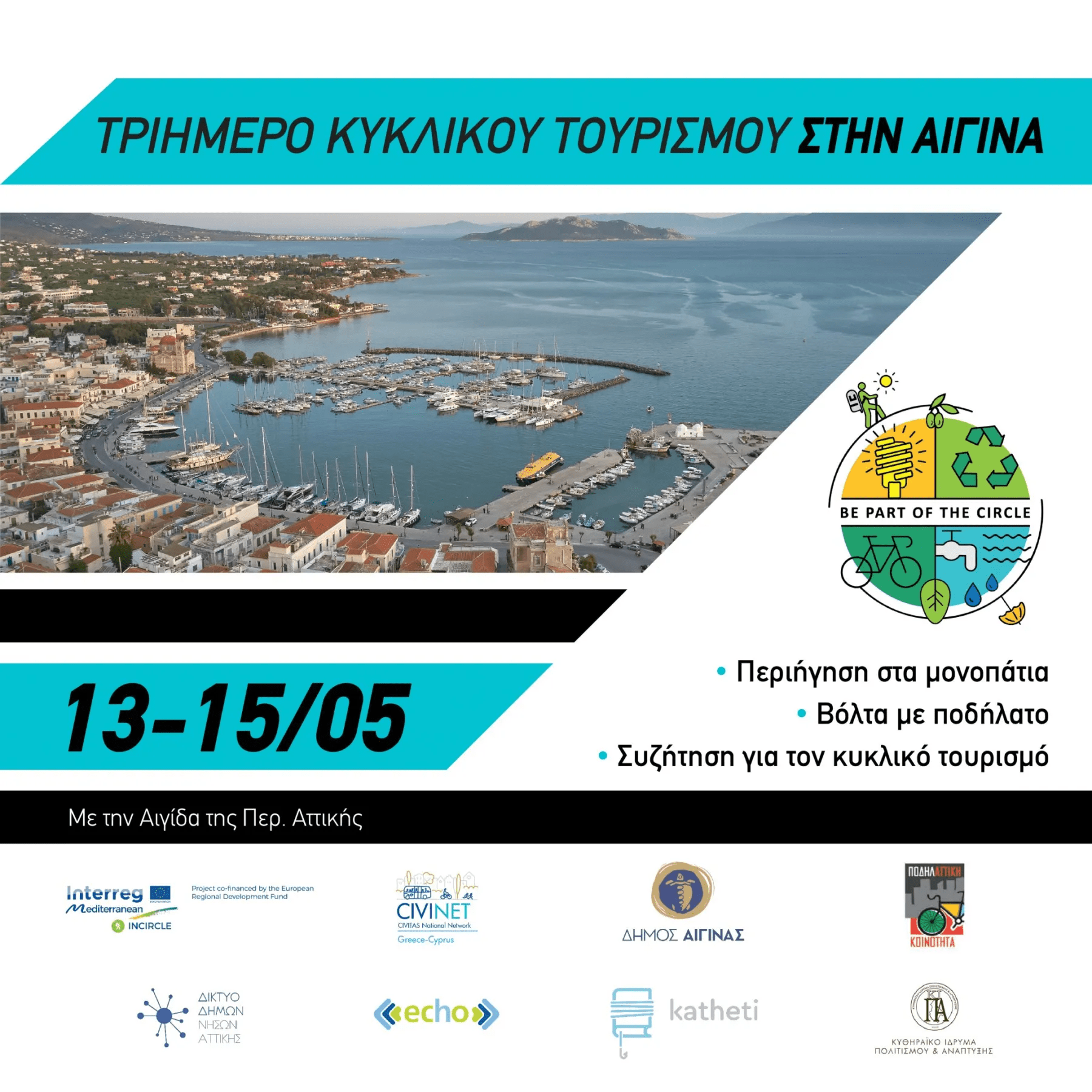 Το τριήμερο έκλεισε με τη βιωματική γνωριμία του κοινού με τις αρχές και τις πρακτικές του περιπατητικού, του ποδηλατικού και του εν γένει «κυκλικού τουρισμού»: περιήγηση στο νησάκι της Μονής, ποδηλατική βόλτα, πεζοπορία στα μονοπάτια της Αίγινας και πολλές εποικοδομητικές συζητήσεις μεταξύ των συμμετεχόντων.