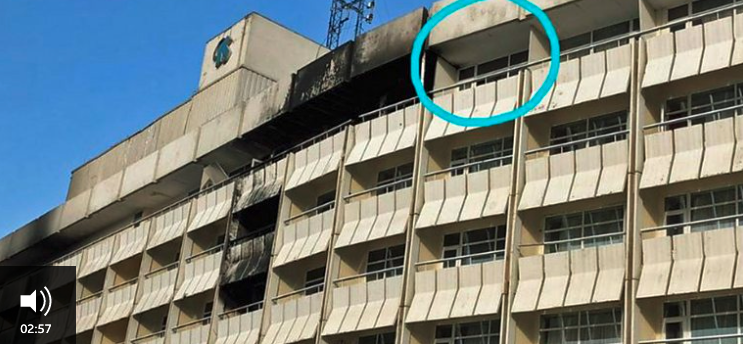 Κατά τις 11.30 π.μ. φαινόταν ότι είχε απομείνει μόνο ένας ένοπλος κοντά μου – ο άνδρας στο δωμάτιο 521. Λίγο αργότερα άρχισα να ακούω άλλους θορύβους και ανθρώπους να περπατούν προς το δωμάτιό μου, αλλά δεν μπορούσα να δω αν ήταν οι κακοί ή οι καλοί. Γύρω στις 11.40 π.μ. κάποιος φώναξε: “Αστυνομία! Αστυνομία!” με αφγανική προφορά, αλλά αποφάσισα να μην βγω έξω σε περίπτωση που ήταν οι κακοί. Στη συνέχεια, μετά από 10 ή 20 δευτερόλεπτα άκουσα κάποιους ανθρώπους με αγγλική προφορά να φωνάζουν επίσης “Αστυνομία!” και χάρηκα τόσο πολύ που άρχισα να φωνάζω και να σέρνομαι από το κρεβάτι.