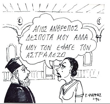 -Τον Αστραλέζο στον έφαε η Σπυριδωνιά με το κούνημά της κι όχι η Ελενίτσα με το μάτι της. Μπορεί να μην το λέει το Ευαγγέλιο, Βασιλικώ μου, αλλά αυτές οι δουλειές θέλουνε κούνημα τέκνο μου. Εμένα, αν δεν μου κουνιότανε η παπαδία, ιερομόναχος θάμουνα.