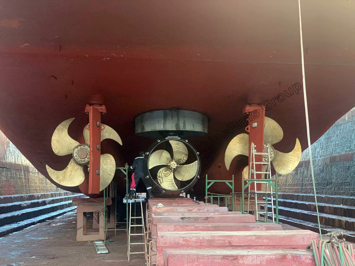 Σχετικά με την προσθήκη τρίτης μηχανής είχαμε γράψει πρώτοι στο φύλλο μας της 1ης Νοεμβρίου 2020 και τώρα αυτό έγινε πραγματικότητα. Στη φωτογραφία (με άδεια της ιστοσελίδας Pantelis Fyssas) είναι λίγες μέρες πριν την έξοδο του πλοίου από την δεξαμενή και δείχνει τις τρεις προπέλες με τις οποίες πλέον θα κινείται το σκάφος.