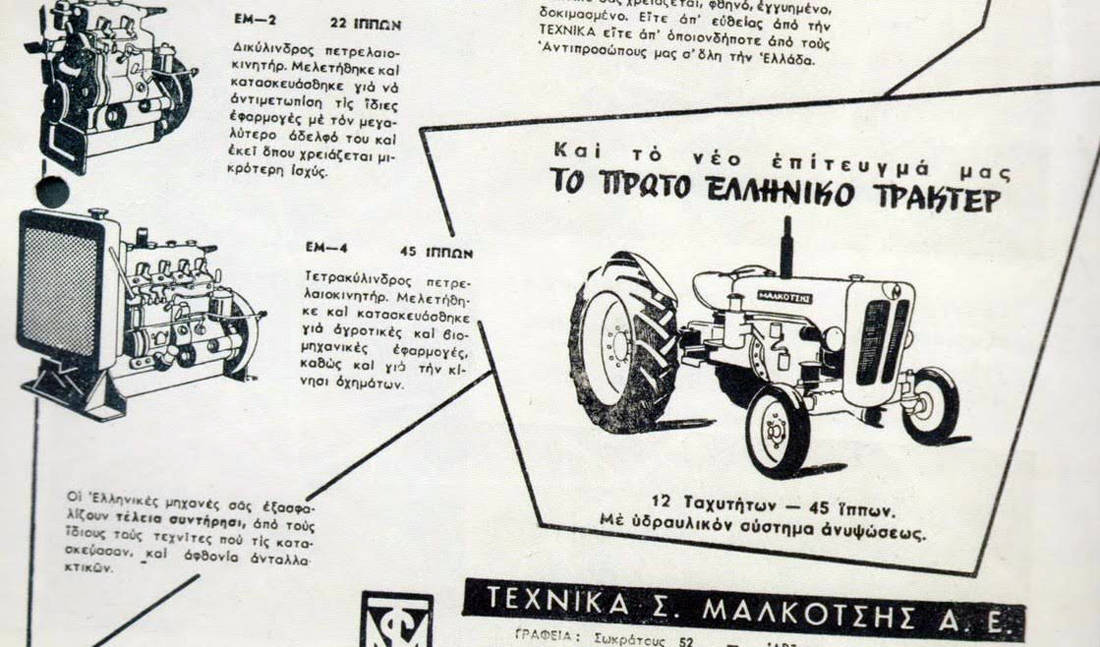 Στο εργοστάσιο του Διπλ. Μηχανολόγου Μηχανικού Σ. Μαλκότση, που προπολεμικά λειτουργούσε ως μηχανουργείο, κατασκευάζονταν τώρα εν σειρά μονοκύλινδροι και, σε μικρότερο αριθμό, τετρακύλινδροι κινητήρες Diesel που στα πρώτα δύσκολα μεταπολεμικά χρόνια κάλυπταν τις ανάγκες των αγροτικών αρδευτικών αντλιοστασίων, αλλά και την κίνηση των πολλών μικρών αλιευτικών σκαφών, τις βιοτεχνικές και άλλες συναφείς εφαρμογές με χαμηλό κόστος.