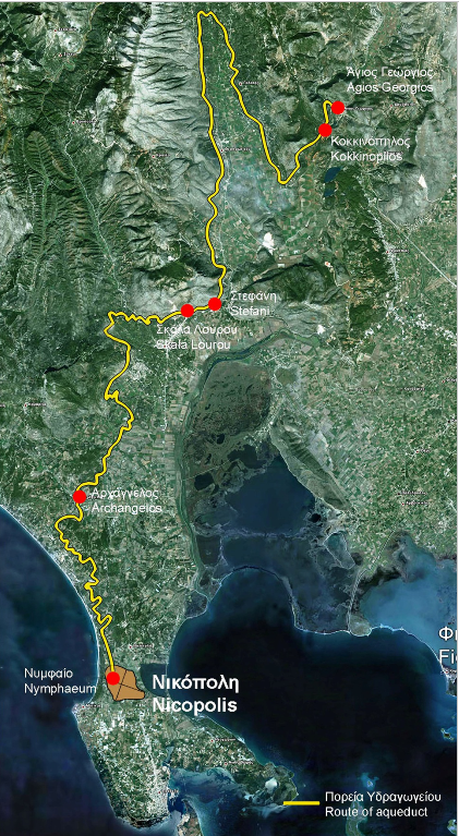 Xάρτης της διαδρομής του υδραγωγείου, από τις πηγές μέχρι την Νικόπολη.