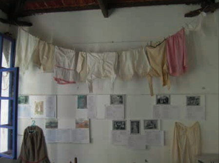 Οι πρώιμοι ταξιδευτές που απεικονίζουν τα ρούχα των Κυθήρων, ο Castellan στα 1808 και ο Sshweidnitz στα 1825, μας δίνουν εικόνες από Ανατολίτισσες με σαλβάρια, που συνάδει με την περί Δυτικών εικόνα γενικά της Ελλάδας. Θεωρούμε λοιπόν ως ανακριβείς τις απεικονίσεις αυτές, αφού -ακόμη κι αν είδαν κάποιες αυτές δεν θα ήταν ντόπιες αλλά ενδεχομένως γυναίκες από την Κρήτη, πρόσφυγες στη νήσο. Ο πρώτος ταξιδευτής που αποτύπωσε σωστά, αλλά και μας έδωσε στοιχεία για τα χρώματα των ρούχων, υπήρξε ο EdwardLear, που επισκέφτηκε τη νήσο τον Μάιο του 1863. Τα χρώματα που περιγράφει, τόσο στα αντρικά αλλά πολύ περισσότερο στα γυναικεία, είναι κυρίως το κόκκινο, πράσινο και το σκούρο μπλε, που επιτυγχάνονταν με φυτικά ή ορυκτά υλικά. Εντόπισε το λευκό κεφαλομάντηλο, ένα διαχρονικό χαρακτηριστικό των γυναικών τόσο στην καθημερινή όσο και στην γιορτινή φορεσιά. Η έρευνα που διεξάγομε σχετικά είναι συνδυασμός πολλών πηγών αλλά η πρωταρχική πηγή απτού υλικού υπήρξε η Λαογραφική Συλλογή. Έτσι, στα πλαίσια της προβολής του υλικού της, προσπαθήσαμε φέτος τον Αύγουστο (10 ως 14 του μήνα στο Μαρκάτο της Χώρας) να καταδείξουμε όχι μόνον τα ρούχα που περιλαμβάνονται στην συλλογή της αλλά και να τεκμηριώσουμε, με φωτογραφικό υλικό και κείμενα, την εξέλιξη και τις ιδιαιτερότητες των ρούχων, μαζί με αντικείμενα επεξεργασίας της πρώτης ύλης (ξάστρες μαλλιού, φορητό εκκοκκιστήριο βαμβακιού, μαγγάνι λιναριού, ανέμη και αδράχτια). Τα ρούχα αυτά δεν μπορούν να εκτεθούν στην Συλλογή εύκολα, ενώ μια εξειδικευμένη έκθεση μας επέτρεψε να παρουσιάσουμε μια πληθώρα καθημερινών αλλά και γιορτινών από αυτά. Η προσέλευση κοινού υπήρξε αρκετά ικανοποιητική. Δύο γυναικεία αντικείμενα υπάρχουν σε μεγάλους αριθμούς: νυχτικά και βράκες-εσώρουχα. Επίσης αρκετές είναι και οι καθημερινές, ντρίλινες, φούστες που φορούσαν οι χωρικές, κάποιες φθαρμένες αλλά και αρκετές αχρησιμοποίητες -αφού οι αντίστοιχες από έτοιμο ύφασμα ήταν πολύ πρακτικότερες και ελαφρύτερες. Υφασμάτινο κομπινεζόν και μισοφόρια, ακόμη κι από χασέ, καθώς και πουκάμισα συμπληρώνουν το γυναικείο κομμάτι. Εκτός από το μόνιμα εκτιθέμενο στη Συλλογή σπαλλέτο άλλο ένα αρκετά παλιό, ρίζινο, μας δόθηκε ως δωρεά λίγες μέρες πριν την έκθεση, και το οποίο αντικαθιστά πλέον το προηγούμενο. Μέσα από την φωτογραφική τεκμηρίωση της έκθεσης είδαμε τις τοπικές ιδιαιτερότητες αυτής της γιορτινής γυναικείας φορεσιάς, όπως επίσης τεκμηριώθηκε και η ‘εξαφάνιση’ της ανδρικής βράκας, είτε ως καθημερινή είτε ως εορταστική, ήδη από τα τέλη του 19ου αι. Αλλά και οι φωτογραφίες με την καθημερινή ένδυση μας διαφώτισαν σχετικά με την διαχρονικότητα των ρούχων, μέχρι την δεκαετία του 1960, οπότε και το έτοιμο ρούχο αντικαθιστά πλήρως όλα τα καθημερινά. Εντυπωσιακό είναι το κομμάτι με τα βαπτιστικά ρούχα, μεταξύ των οποίων και ένα από την Σμύρνη, αλλά και σπάργανα κι υφασμάτινες πάνες. Επίσης υπάρχει ένα, σπάνιο πλέον, χειμερινό αντρικό παντελόνι, από μαλλί γίδας, με το απαραίτητο μακρύ εσώρουχο-βράκα αλλά και η κάπα ή γαμπάς. Τέλος στο κέντρο της έκθεσης ήταν μια φωτογραφία από εορτασμό στα Μυρτίδια, που χρονολογήθηκε με ασφάλεια μεταξύ 1892-1894. Οι πληροφορίες που μας απέδωσε τόσο για το σπαλλέτο όσο και για την βράκα, αλλά και γενικά για το ρούχο στα παλιά Κύθηρα, υπήρξαν ανεκτίμητες. Η συγκεκριμένη θα αποδοθεί στο Ιστορικό Αρχείο Κυθήρων, ώστε να αποτελέσει τμήμα