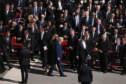 Ο Τραμπ έκανε την εμφάνισή του στην πλατεία του Αγίου Πέτρου το πρωί του Σαββάτου, συνοδευόμενος από τη Μελάνια – και κάθησε σε απόσταση δέκα ατόμων από τον ουκρανό ομόλογό του, Βολοντίμιρ Ζελένσκι (νωρίτερα πάντως τον είχε συναντήσει).