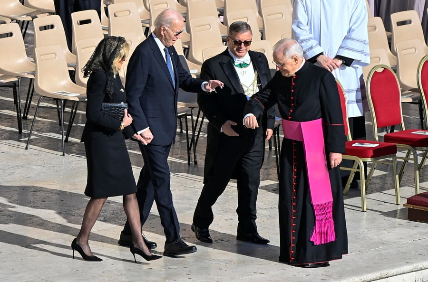 To παρόν έδωσαν και ο πρώην πρόεδρος των ΗΠΑ Τζο Μπάιντεν, με τη σύζυγό του Τζιλ, η οποίοι εθεάθησαν να λαμβάνουν από νωρίς τις θέσεις τους στην πλατεία του Αγίου Πέτρου.