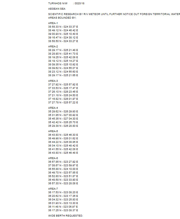Με την Navtex υπ’ αριθμόν 20 του 2018, η οποία εκδόθηκε από τον παράκτιο σταθμό της Σμύρνης, οι Τούρκοι δεσμεύουν ακόμη 7 περιοχές στο Αιγαίο για έρευνες από το γερμανικό ερευνητικό πλοίο. Μάλιστα μία από τις περιοχές που δεσμεύουν οι Τούρκοι είναι ανατολικά των Κυθήρων αλλά τουλάχιστον σε διεθνή ύδατα.