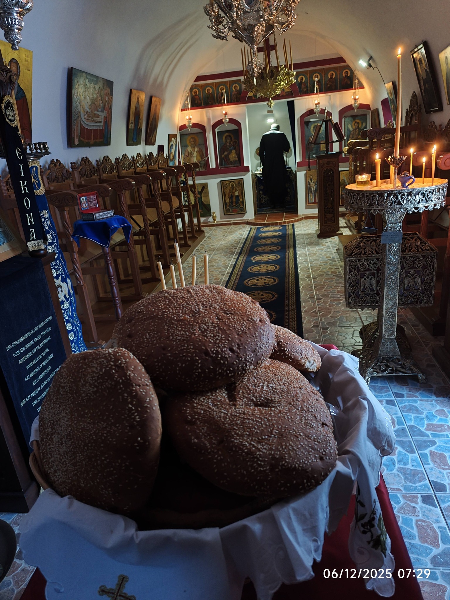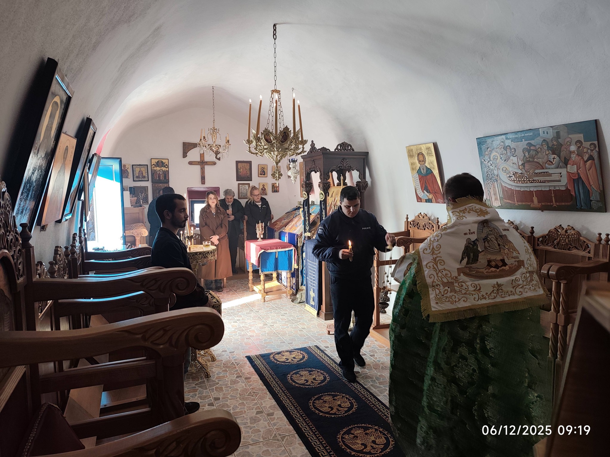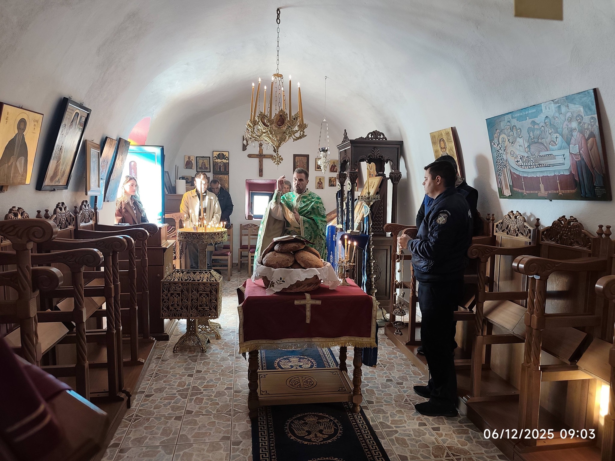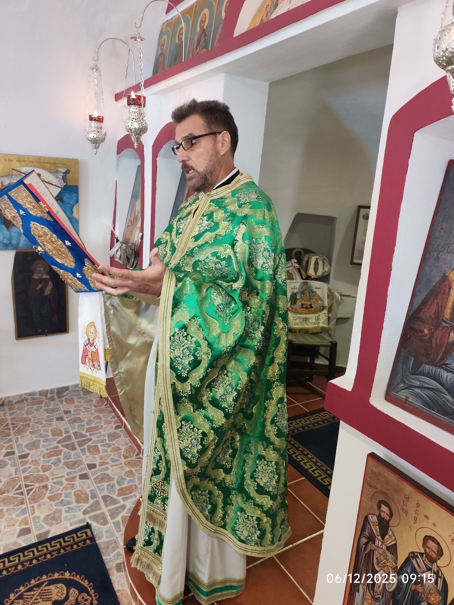 Η πανηγυρική Θεία Λειτουργία τελέσθηκε, με την ευλογία του επιχωρίου Μητροπολίτου κ. Σεραφείμ, από επισκέπτη Ιερέα εκ της Κύπρου, ο οποίος ευλόγησε τους προσφερθέντες άρτους και ανέπεμψε δεήσεις για τους ναυτικούς μας.