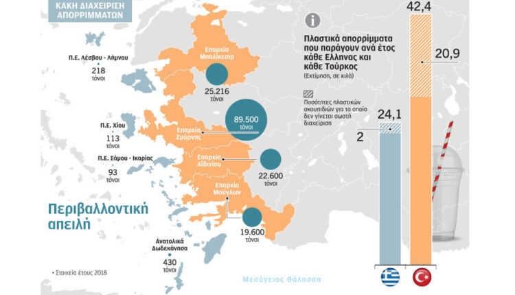 Από πού προέρχονται τα πλαστικά που καταλήγουν στο Αιγαίο; Νέα ευρωπαϊκή έκθεση καταδεικνύει τη χαώδη διαφορά ανάμεσα στις ελληνικές και τις τουρκικές ακτές, όσον αφορά την «παραγωγή» και την κακή διαχείριση πλαστικών απορριμμάτων. Οι πολίτες των παράκτιων της γειτονικής χώρας παράγουν σχεδόν διπλάσια ποσότητα πλαστικών απορριμμάτων, διαφορά που γίνεται ακόμη μεγαλύτερη αν συγκριθούν οι επιδόσεις των Δωδεκανήσων και των νησιών του βορείου Αιγαίου με τις απέναντι τουρκικές επαρχίες.