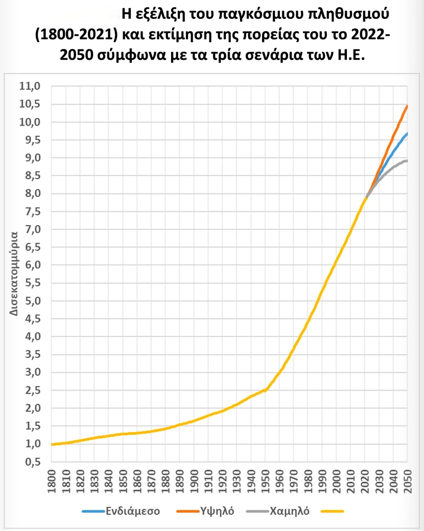 Συγκεκριμένα ο ρυθμός αύξησής του, που έφθασε στο μέγιστο (πάνω από 2% ετησίως) πριν από 60 χρόνια, μειώθηκε στο μισό (0,9%) το 2022 και θα συνεχίσει να μειώνεται μέχρι την πιθανή σταθεροποίησή του στα τέλη του αιώνα μας, σύμφωνα πάντοτε με το «ενδιάμεσο» σενάριο του ΟΗΕ.
