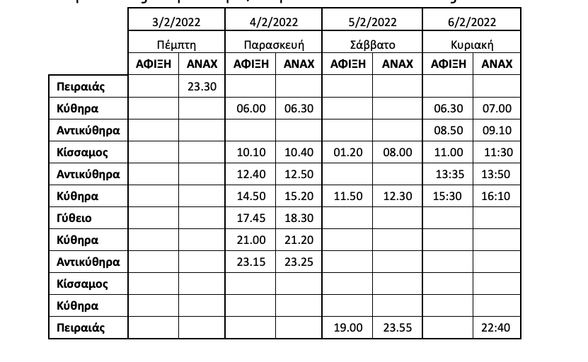 Σε συνέχεια του δελτίου τύπου της 31ης Ιανουαρίου, ενημερώνουμε το επιβατικό κοινό ότι μετά τη βελτίωση των δυσμενών καιρικών συνθηκών που επικρατούν, τα δρομολόγια του Ε/Γ – Ο/Γ πλοίου μας «AQUA JEWEL» από αύριο έως Κυριακή 6/2 τροποποιούνται ως κάτωθι: