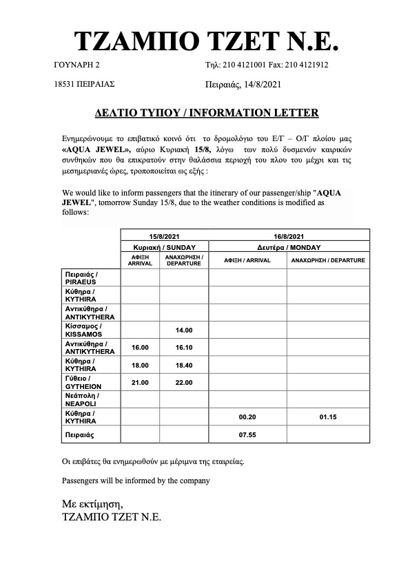 Τροποποίηση δρομολογίου Aqua Jewel την Κυριακή 15/8, λόγω πρόβλεψης δυσμενών καιρικών συνθηκών