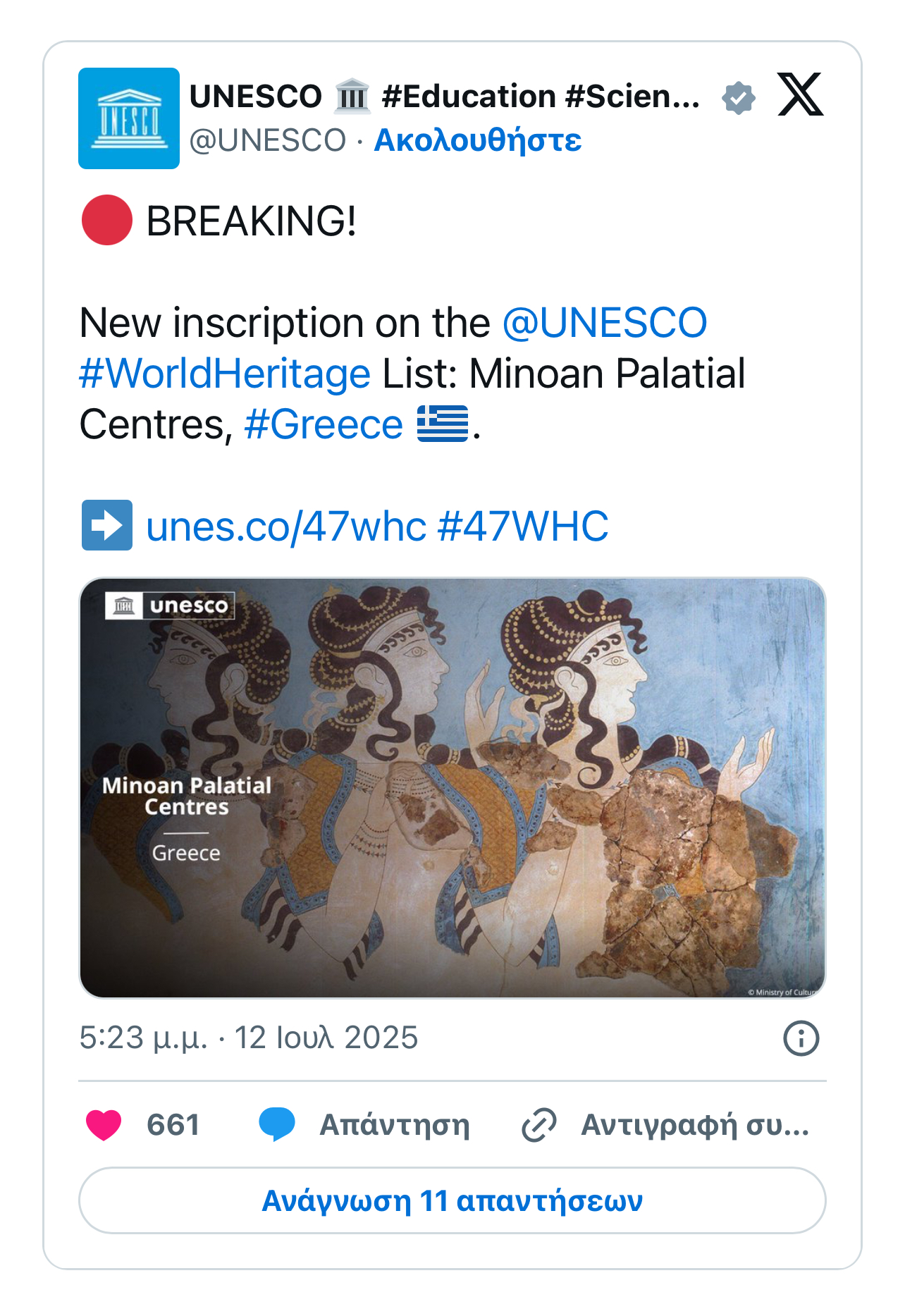 UNESCO: Τα Μινωικά Ανάκτορα στον κατάλογο Παγκόσμιας Κληρονομιάς