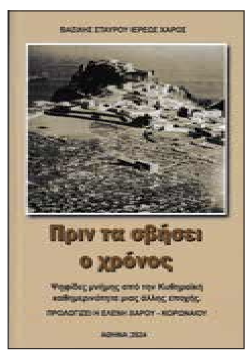 Ένα μικρό, αλλά με μεγάλο ενδιαφέρον βιβλίο κυκλοφόρησε ο Β.Σ. Χάρος. Με τίτλο, Πριν τα σβήσει ο χρόνος και υπότιτλο, Ψηφίδες μνήμης από την Κυθηραϊκή καθημερινότητα μίας άλλης εποχής, ο συγγραφέας παραθέτει στις 110 σελίδες του βιβλίου μερικές ιστοριούλες της εποχής της νιότης του, διάφορα συμβάντα των μαθητικών και νεανικών του χρόνων, ευτράπελα επεισόδια από γραφικούς συμπατριώτες και ενδιαφέροντες τύπους της εποχής και γενικά, επιτυγχάνει να μεταφέρει τους αναγνώστες του στο κλίμα μίας εποχής, την οποία πολλοί θα έχουν ζήσει και θα διαβάσουν με ενδιαφέρον όσα ιστορεί με έξυπνο τρόπο στο μικρό του πόνημα.