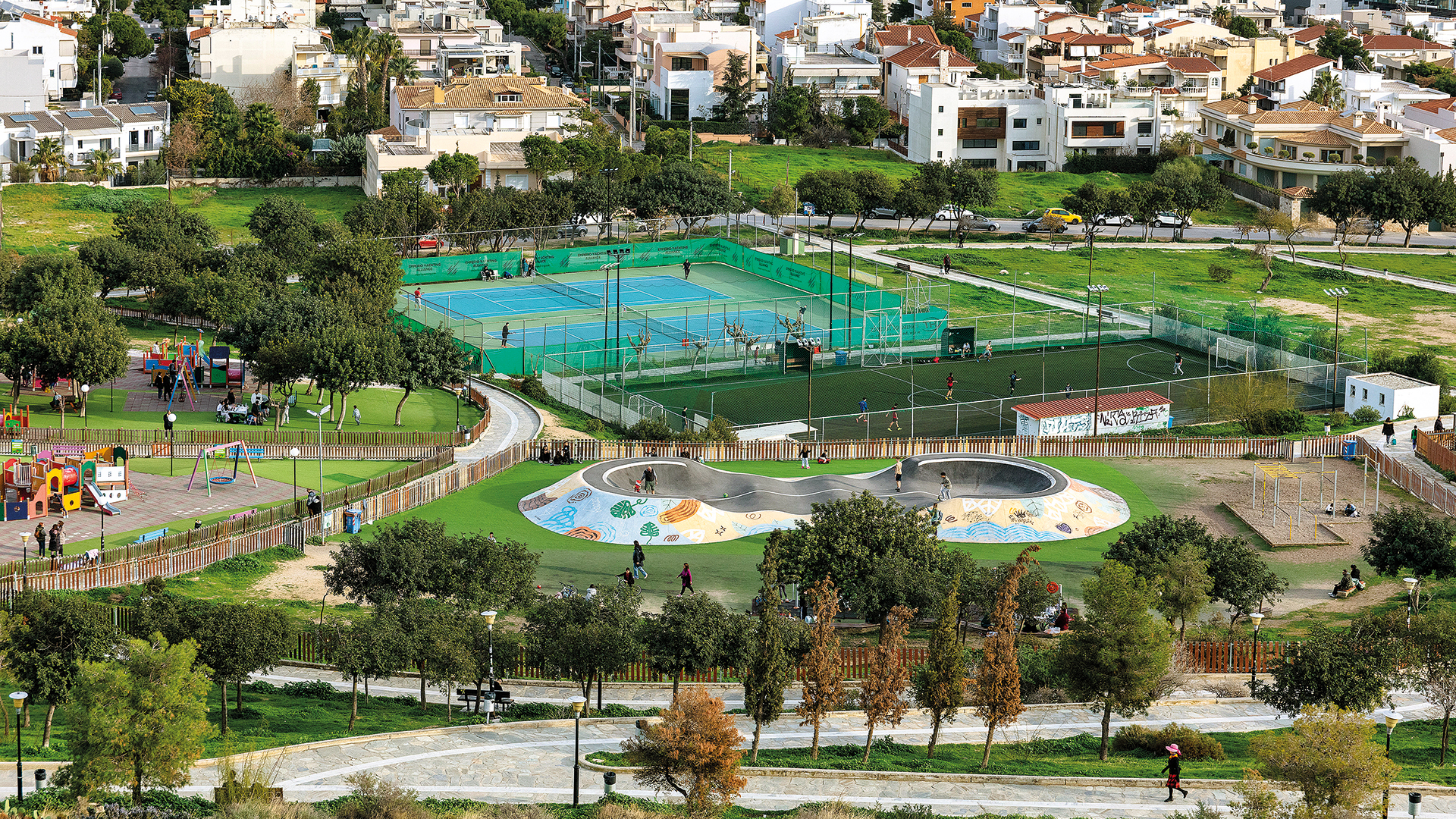 Ξεκινώντας την ανηφορική μας περιήγηση, συναντάμε τον Δημήτρη Λεγάκη με τα δύο του σκυλιά, τη Μάιρα και την Μπαμπόλ, τις «μασκότ» του λόφου, στην καθιερωμένη τους βόλτα. «Ζω εδώ από το 1959, όταν μετακομίσαμε οικογενειακώς από τη Νάξο στην Αθήνα», μας λέει. «Τότε, η λεωφόρος Ιωνίας ήταν χωματόδρομος και ο λόφος ήταν εντελώς παραμελημένος· έχω φωτογραφίες του γιου μου, που σήμερα είναι 53 ετών, να κάνει ως πιτσιρικάς άλματα πάνω από μπάζα». Μια ματιά γύρω μας αρκεί για να αντιληφθούμε ότι τα δεδομένα έχουν στο μεταξύ πλήρως αντιστραφεί: το μεγαλύτερο μέρος του λόφου είναι στρωμένο με πλάκα Καρύστου, με ενσωματωμένη κλίση για να φεύγουν τα νερά της βροχής, χαμηλά υπάρχουν τρία γήπεδα (δύο τένις και ένα ποδοσφαίρου 5 x 5), δύο παιδικές χαρές, μία τεράστια πίστα pumptrack για ποδήλατο και πατίνι, όργανα γυμναστικής, ένα πάρκο για σκύλους αλλά και πολλά ανοίγματα κατάλληλα για ποδήλατο, πατίνι, κρυφτό και κυνηγητό.