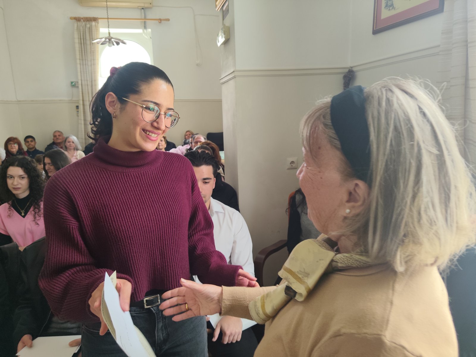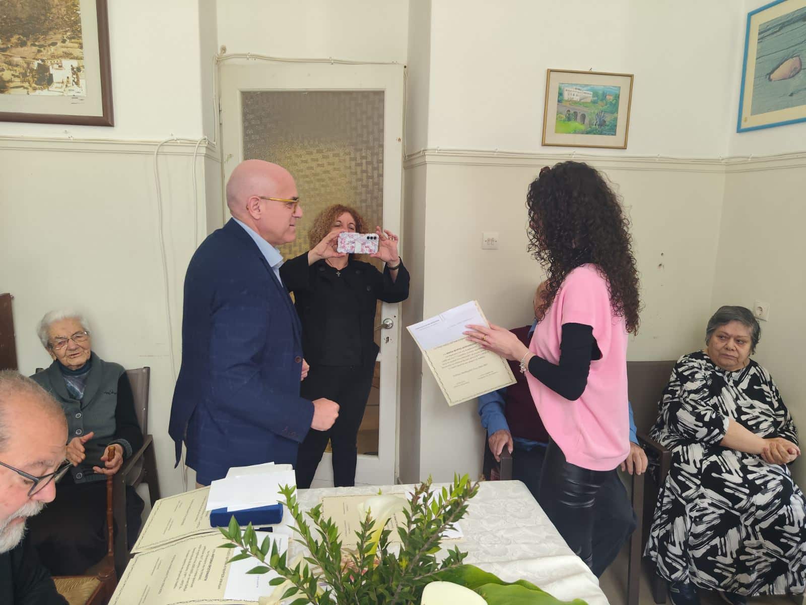 Μετά τη λήξη της τελετής, οι βραβευθέντες, οι συγγενείς τους και γενικά όσοι συμμετείχαν σ’ αυτήν αντάλλαξαν ευχές και συνομίλησαν με τους περιθαλπόμενους στο Γηροκομείο.