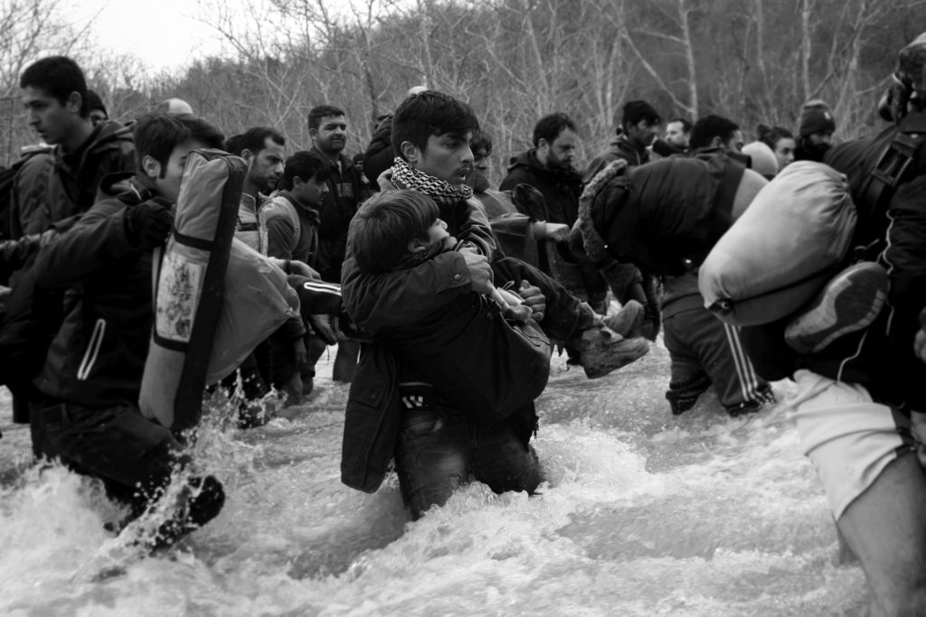 Πρόσφυγες και μετανάστες από τον αυτοσχέδιο καταυλισμό στην Ειδομένη διασχίζουν ένα παγωμένο ποτάμι σε μία προσπάθεια να περάσουν τα κλειστά σύνορα προς την ΠΓΔΜ