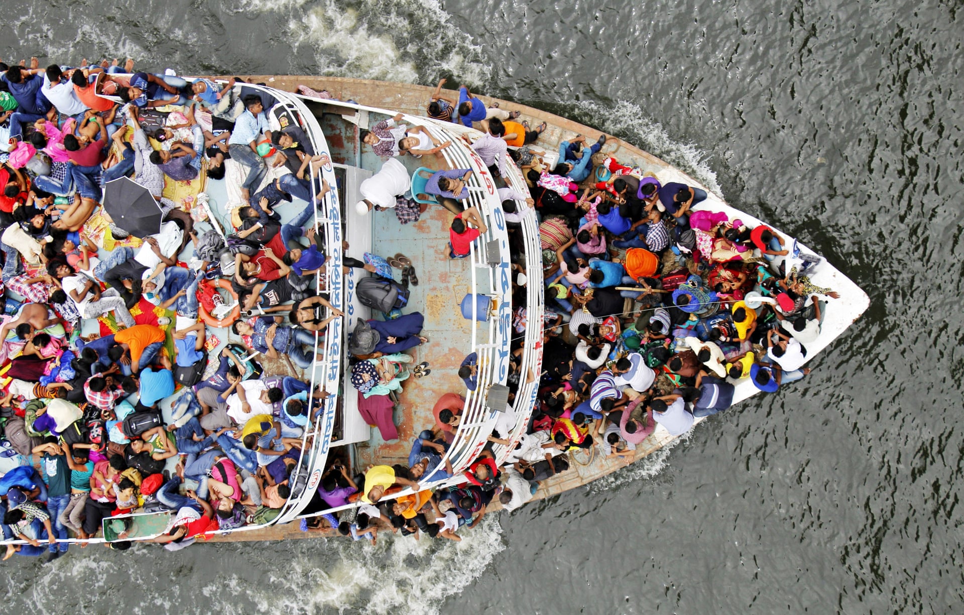 «Εσωτερικοί μετανάστες», στιβαγμένοι σε ένα πλοίο, διασχίζουν τον ποταμό Dhaleshwari στη Ντάκα του Μπαγκλαντές, πηγαίνοντας από την πρωτεύουσα στα σπίτια τους για να γιορτάσουν το μουσουλμανικό Εΐντ μαζί με τις οικογένειες τους