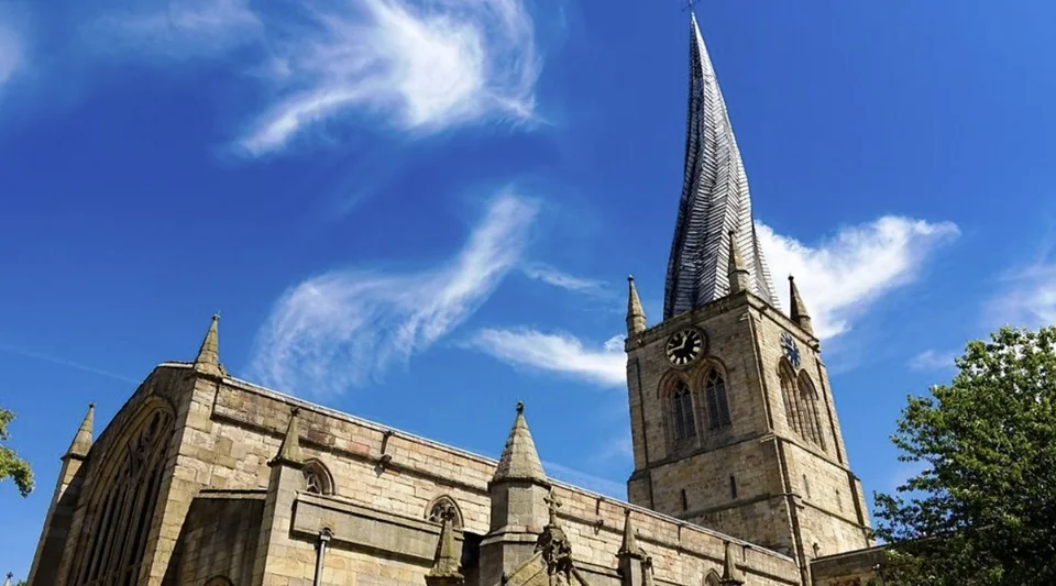 Στο Τσέστερφιλντ της Αγγλίας, ο ναός του Αγίου Μαρίας και Πάντων των Αγίων ξεχωρίζει για το καμπαναριό του, γνωστό ως The Crooked Spire. Η σκεπή του δεν είναι μόνο στραβή — είναι και στριφογυρισμένη σαν γιγάντινος φελλός.