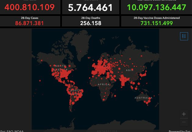 Συγκεκριμένα τα κρούσματα ανέρχονταν το πρωί της Τετάρτής σε 400.810.109 και οι νεκροί σε 5.764.461 ενώ παγκοσμίως έχουν χορηγηθεί 10.097.136.447 δόσεις εμβολίου για κορονοϊό.