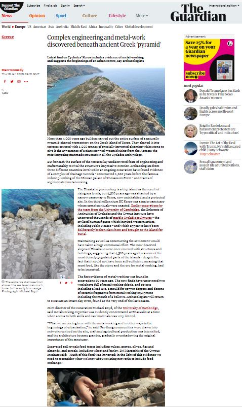 Τα παραπάνω δημοσιεύει σήμερα (18/1) στην ιστοσελίδα της η εφημερίδα «Γκάρντιαν», αναφερόμενη στη συνέχιση μιας ιδιαίτερα ενδιαφέρουσας ανασκαφής που φέρνει συνεχώς νέα εντυπωσιακά ευρήματα. Το δημοσίευμα συνεχίζει δίνοντας στοιχεία για την περιοχή: Το Δασκαλειό, μικρή βραχονησίδα σήμερα δίπλα στην Κέρο, με την οποία, πριν από 4.500 χρόνια, ενωνόταν με ένα μικρό πέρασμα και το νησί που την 3η χιλιετία π. Χ. ήταν ένα σημαντικότατο ιερό, όπου πραγματοποιούνταν σύνθετες τελετουργίες. Ο Λόρδος Ρένφριου, συνδιευθυντής των ανασκαφών, ιδρυτικός διευθυντής του Ινστιτούτου Αρχαιολογικών Ερευνών ΜακΝτόναλντ του Κέιμπριτζ κι ένας από τους πιο διακεκριμένους αρχαιολόγους και ερευνητές στον κόσμο, έχει δηλώσει ότι η Κέρος αποτελεί το «αρχαιότερο νησιωτικό ιερό στον κόσμο». Μάλιστα, στη συνέντευξη που έδωσε στις αρχές Σεπτεμβρίου στο ΑΠΕ-ΜΠΕ, με αφορμή τα ογδοεικοστά του γενέθλια, είχε πει μεταξύ άλλων: «Υπάρχουν κι άλλα νησιωτικά ιερά στον κόσμο, αλλά κανένα δεν είναι τόσο παλιό όσο της Κέρου».
