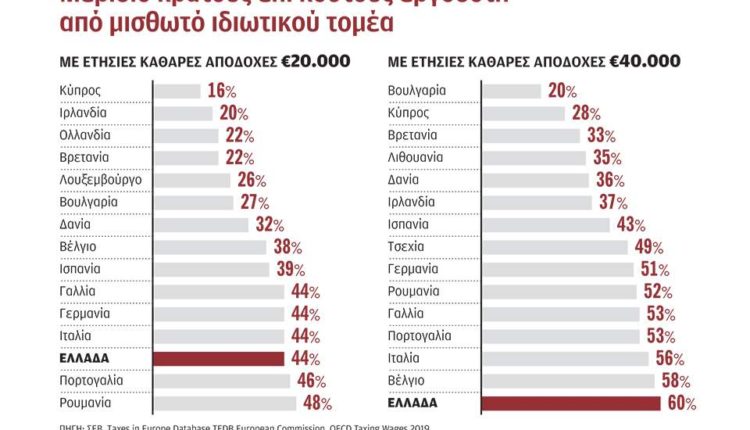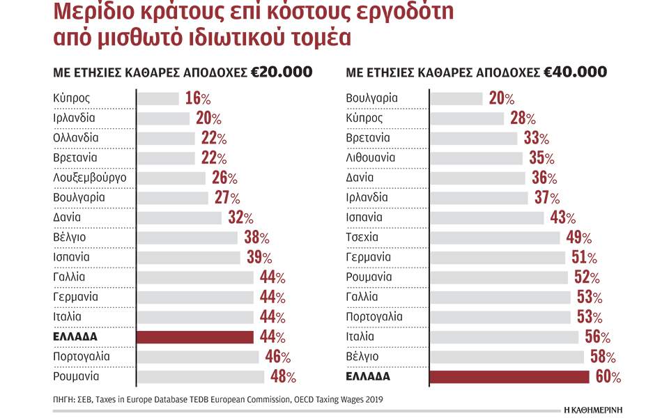 • Για καθαρές αποδοχές 40.000 ευρώ τον χρόνο, «αφαιρείται» μέσω φόρων και εισφορών το 60% του ποσού που πληρώνει ο εργοδότης. Καμία ευρωπαϊκή χώρα δεν αφαιρεί περισσότερο. Η πρόσφατη εξαγγελία μείωσης της ειδικής εισφοράς αλληλεγγύης μειώνει αυτή την επιβάρυνση, αλλά δεν αλλάζει τη σχετική θέση της Ελλάδας. Ενα ανταγωνιστικό ποσοστό επιβάρυνσης θα ήταν γύρω στο 40%.