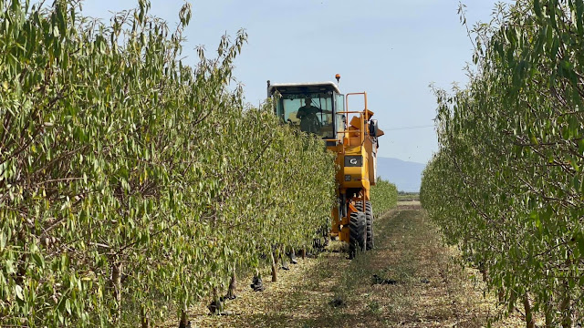 Δείτε πως γίνεται η μηχανική συγκομιδή αμυγδαλιάς πυκνής φύτευσης και η διαδικασία αποφλοίωσης των αμυγδάλων: